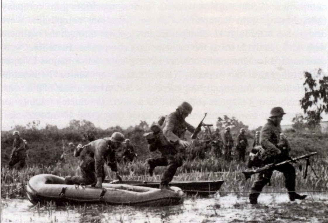 Prajurit infanteri Jerman berjuang menyeberangi rawa-rawa yang banyak terdapat di pinggiran sungai Don dalam gerak maju 6. Armee menuju Stalingrad, musim panas tahun 1942. Mereka menggunakan perahu karet (Schlauchboote) kecil yang berukuran tiga meter dan mampu menampung tiga orang, juga dibantu oleh perahu-perahu kayu yang "dipinjam" dari penduduk lokal. Dua orang awak senjata anti-tank terlihat menumpang di salah satu perahu dengan membawa serta Panzerbüchse PzB.39 7,92mm (Büchse biasanya diterjemahkan sebagai "kontainer", tapi dapat pula berarti "senjata api" dalam ejaan lama). Di perahu lainnya ikut mendarat penembak senapan mesin MG-34 7,92mm dan diikuti oleh Gruppenführer-nya (pimpinan tim) yang memegang senapan mesin ringan MP-40 9mm serta terakhir adalah asisten gunner